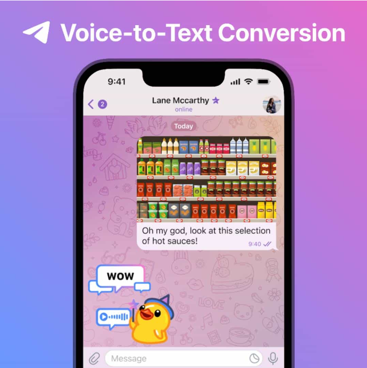 Fitur berikutnya adalah memungkinkan pengguna untuk menkonversi voice note (rekaman suara) menjadi teks. Bagi sebagian orang, mendengarkan rekaman suara sangatlah tidak memungkinkan apabila sedang dalam situasi yang tidak kondusif. Telegram berinovasi untuk pengguna Telegram Premium dapat mengkonversi isi dari rekaman suara menjadi teks yang dapat dibaca. Kalian dapat menggunakan fitur ini dengan mengeklik logo Settings (pengaturan), lalu ke bagian Privacy and Security, dan terakhir pilih opsi Voice Message