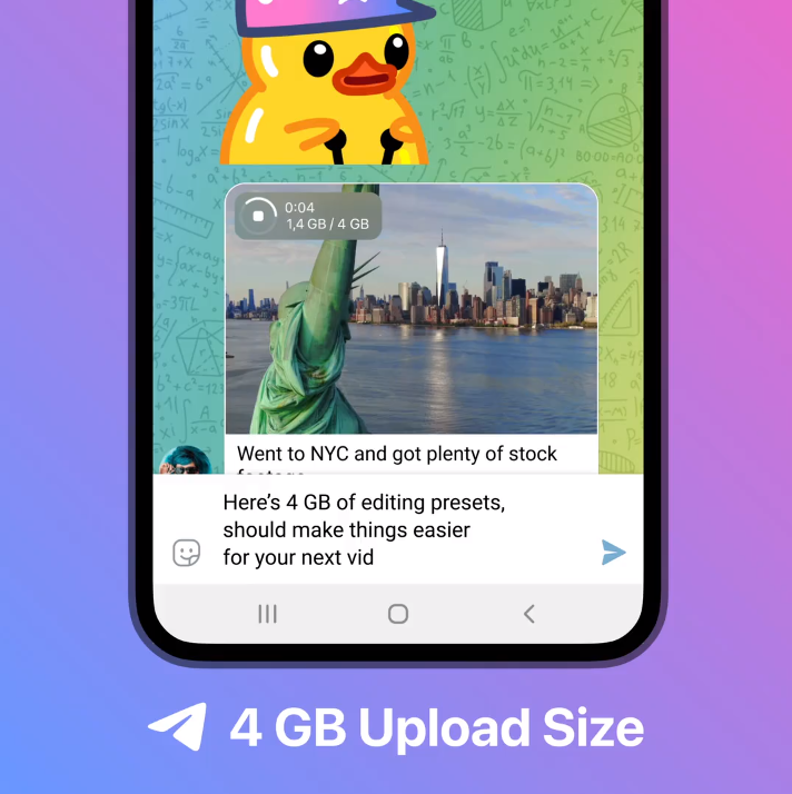 Setiap pengguna, baik premium dan nonpremium, dapat mengunggah file dan media besar berukuran 2 GB. File-file yang dikirimkan akan tersimpan tanpa batas di Telegram Cloud secara gratis yang dapat kalian akses. Terkadang pengguna ingin mengirimkan file yang lebih besar, tetapi Telegram tidak mendukung. Khusus bagi kalian pelanggan Telegram Premium, sekarang dapat mengirim file sebesar 4 GB.