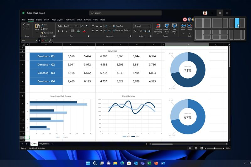 Fitur selanjutnya adalah Snap Layout yang akan memudahkan kalian membuka beberapa tab bar sekaligus dalam satu waktu. Snap Layouts mengalami peningkatan yang semakin baik dalam Windows 11 tahun 2022 kali ini. Kalian dapat mulai memindahkan aplikasi atau folder ke bagian atas layar dan akan muncul opsi snap baru muncul di bagian atas. Setelah itu, kalian dapat mengatur aplikasi dengan cepat ke dalam Snap Layout. Akan muncul beberapa opsi dengan banyak tata letak yang kalian perlukan.
