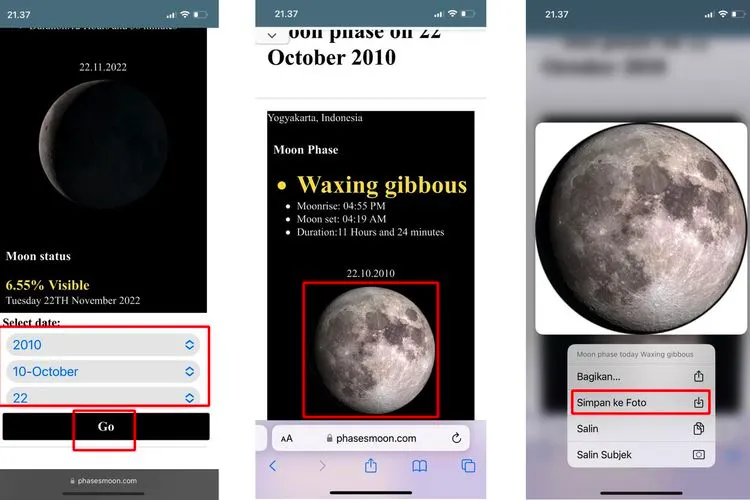 - Kemudian, pilih opsi “Go” dan gambar moon phase sesuai tanggal lahir dan lokasinya bakal muncul.