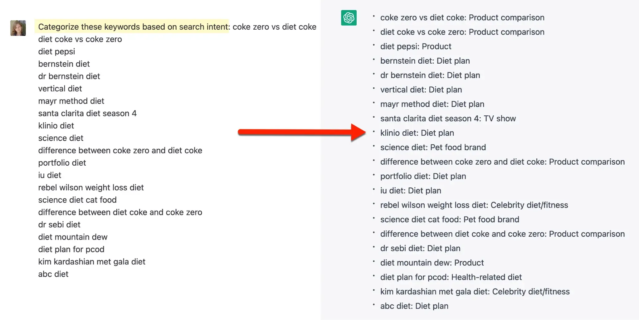 Untuk meningkatkan SEO (optimisasi mesin pencari), kata kunci yang digunakan harus sesuai dengan maksud pencarian tersebut. Pekerjaan untuk menemukan dan menggunakan kata kunci yang tepat sangat menyita waktu dan energi kamu. Maka dari itu, kamu dapat meminta ChatGPT untuk mengatur kata kunci tersebut sesuai dengan maksud pencarian. Seperti cara sebelumnya, kamu hanya perlu meng copy-paste daftar ide kata kunci. Namun, alat ini kurang akurat jika daftar kata kunci terlalu panjang, jadi disarankan untuk membagi daftar menjadi beberapa segmen.