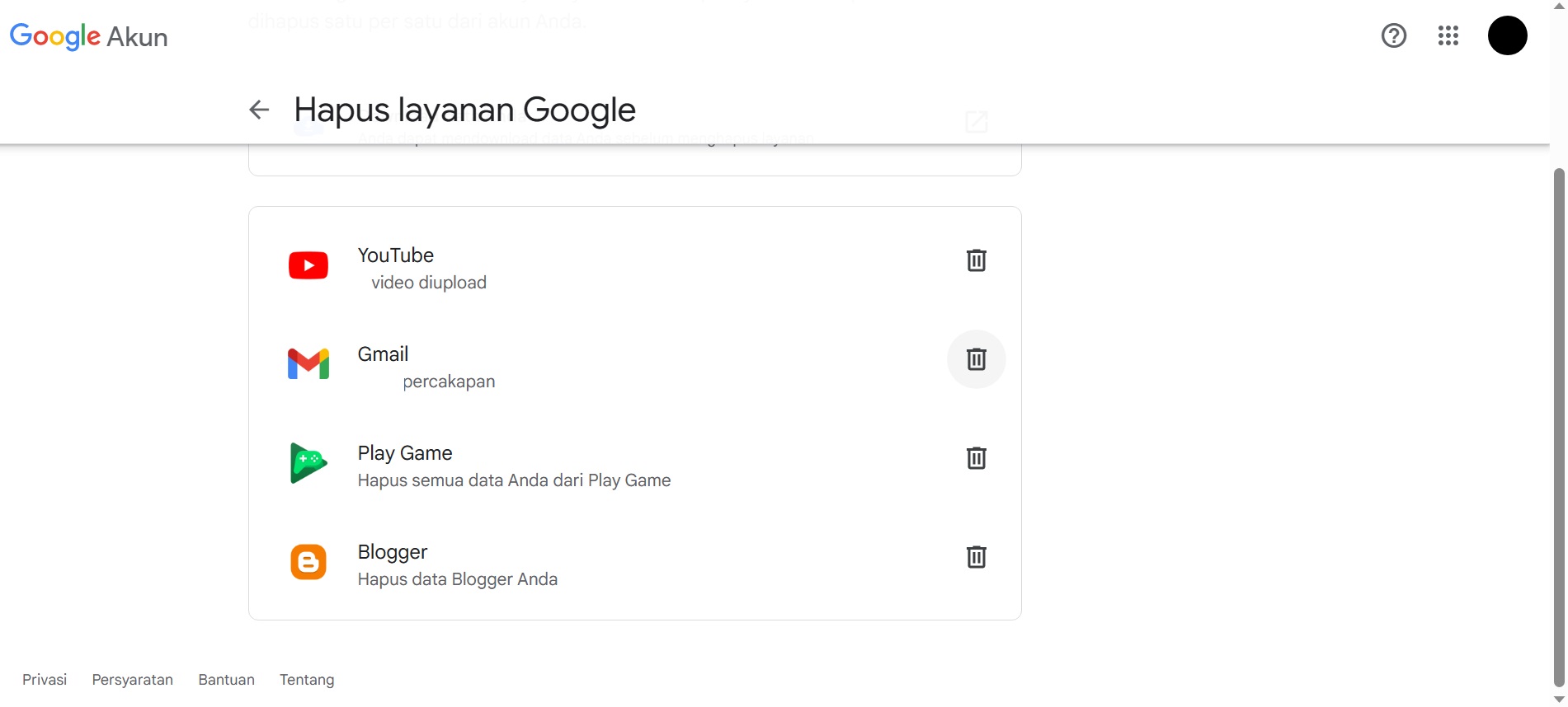 Foto: Teknologi.id/Ratna Alia Syahrani Di halaman hapus layanan Google, kamu dapat melihat beberapa layanan yang kamu miliki dalam akun Google kamu. Untuk menghapus Gmail saja, kamu dapat mengeklik ikon tempat sampah di sebelah Gmail. 6. Email Selain Gmail
