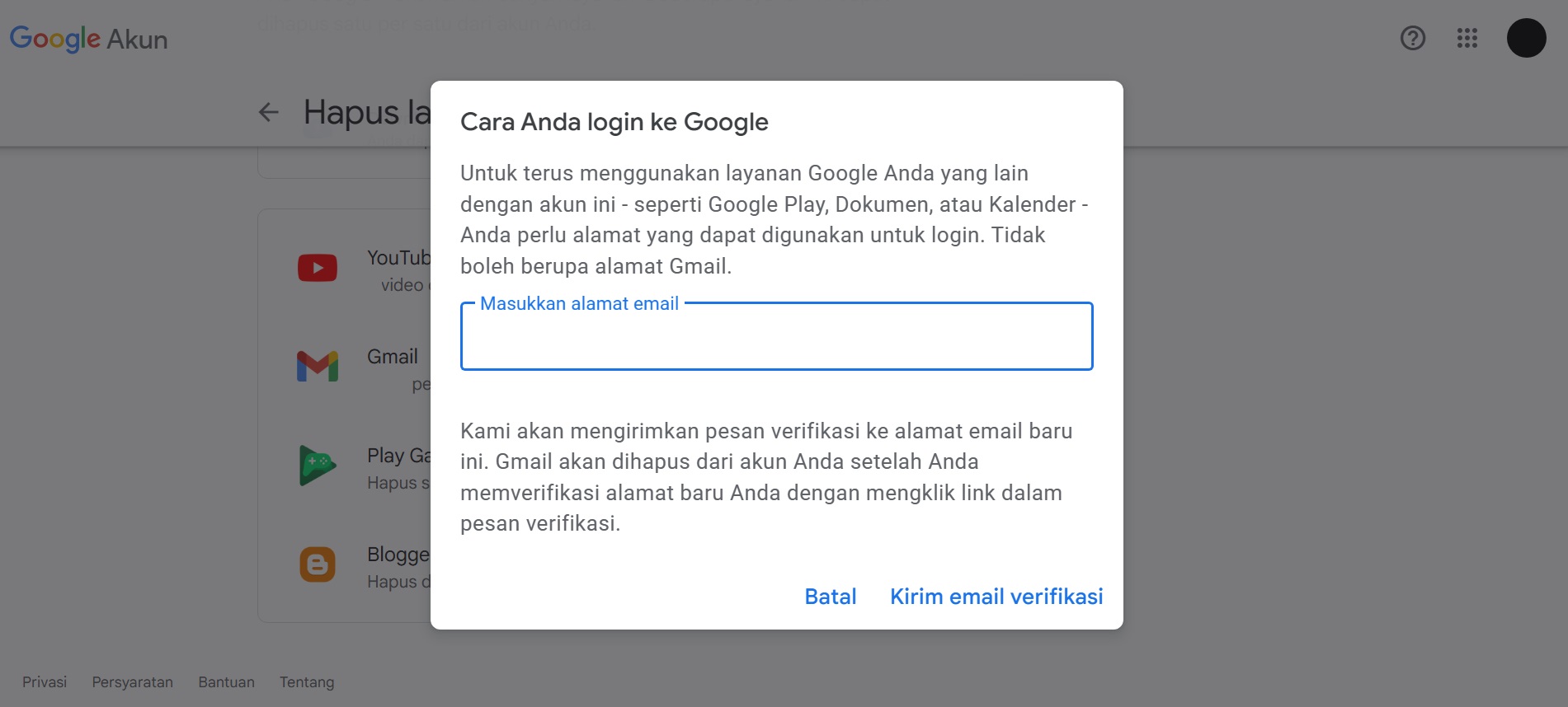 Ketika sudah klik “hapus layanan”, biasanya Google akan meminta verifikasi kata sandi. Jika sudah memasukkan kata sandi yang benar, kamu akan melihat tampilan seperti gambar di atas.