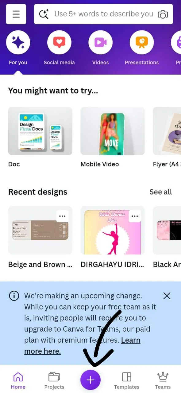 Pertama, buka aplikasi Canva, lalu klik “Buat Desain” atau tanda +. Pilih ukuran kanvas yang kamu butuhkan.