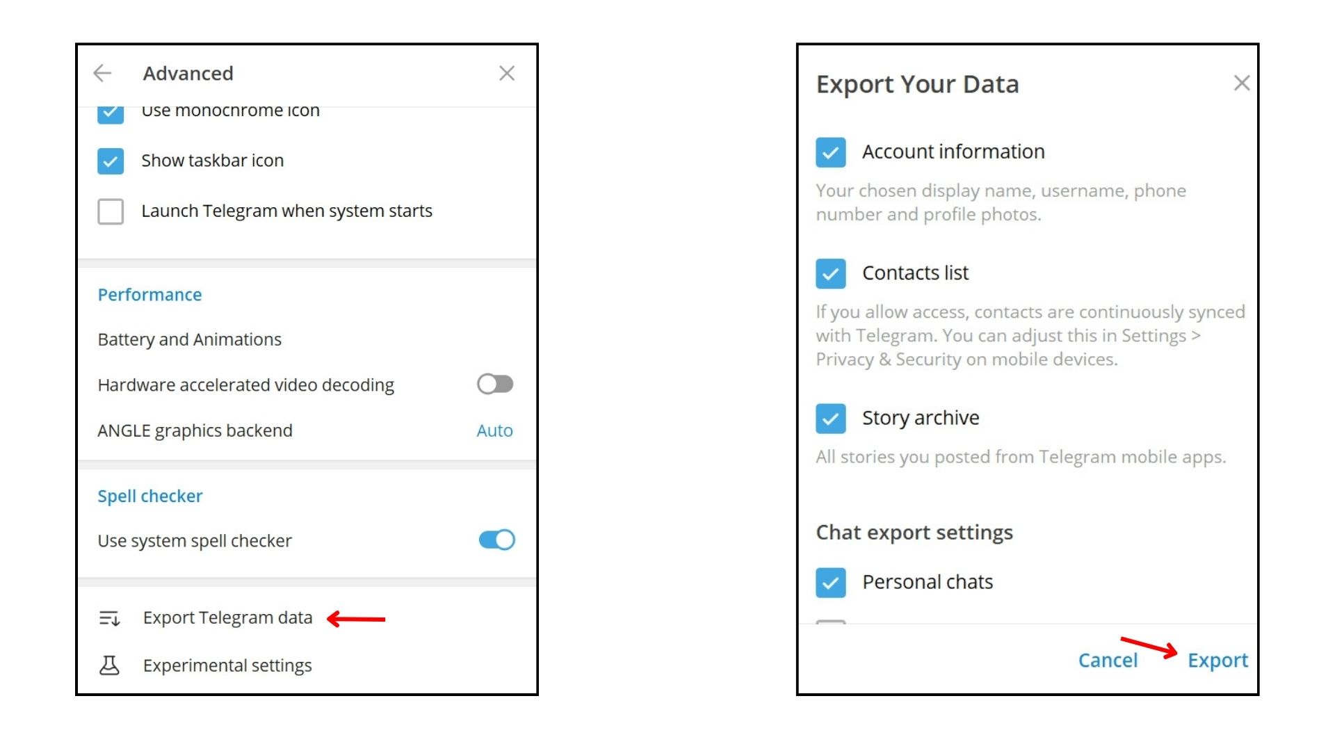 - Pilih "Export Telegram Data", kemudian pilih informasi yang akan di-backup. Informasi dapat berupa informasi akun, daftar kontak, arsip cerita, obrolan personal, obrolan grup, serta media.
