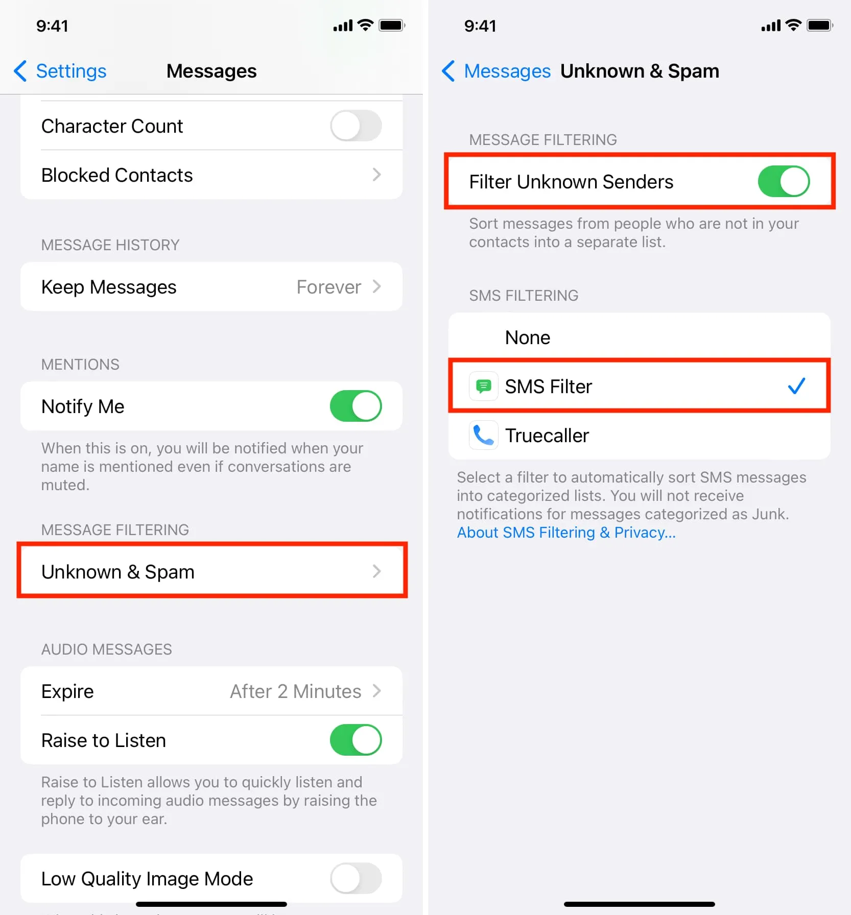 - Aktifkan opsi Filter Pengirim Tak Dikenal (Filter Unknown Senders).