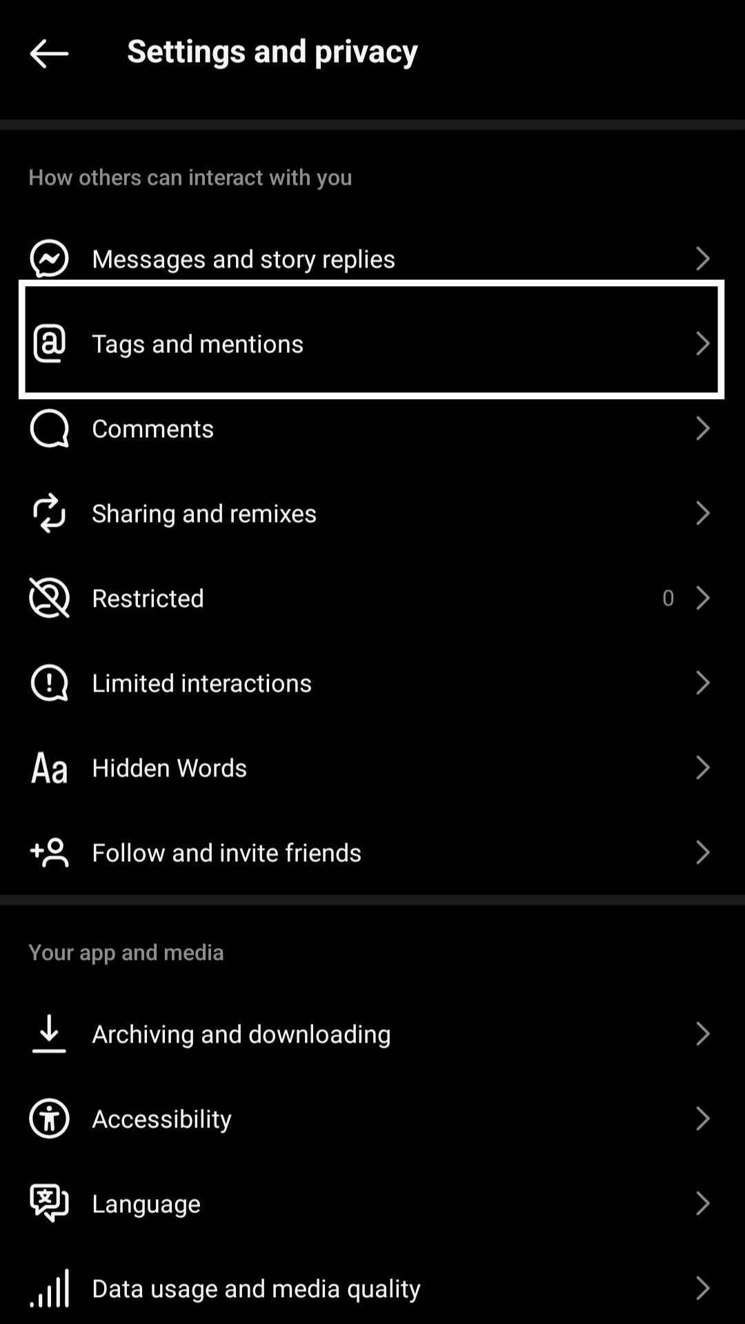 Temukan opsi "Penandaan (Tags)" atau "Foto saya di-tag" (dalam bahasa Inggris).