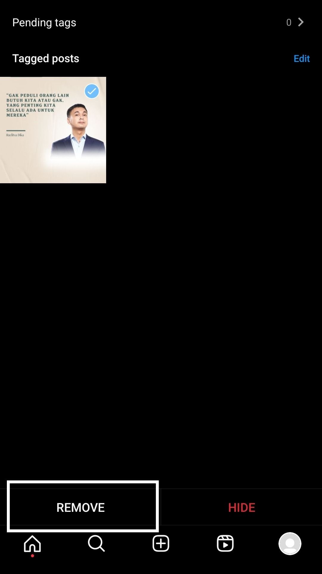 Setelah postingan dipilih, ketuk Remove untuk menghapus dan hide jika hanya ingin menyembuntikan dari profil.