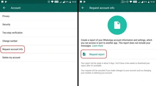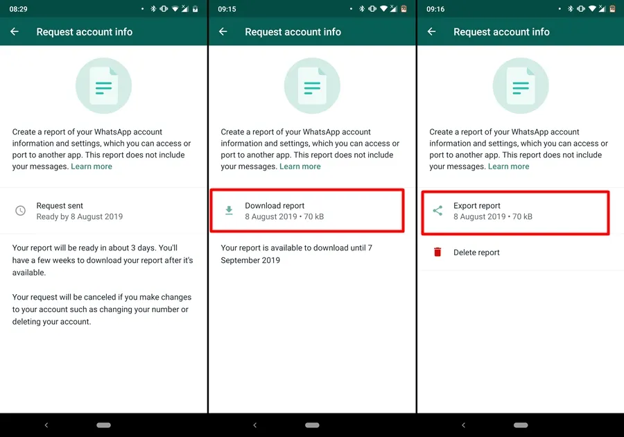 Tampilan 'Minta Info Akun' di WhatsApp akan memberi tahu batas waktu berapa lama kita harus mengunduh laporan. Setelah laporan muncul, ketuk Unduh Laporan.