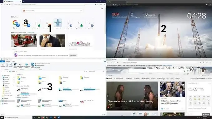 Dua jendela dapat ditampilkan dalam layar terpisah, atau empat dapat ditampilkan dalam pengaturan kuadran. Satu jendela juga dapat diatur untuk mengisi separuh layar sementara dua lainnya mengisi bagian atas dan bawah separuh layar lainnya. Namun, Anda tidak dapat mengambil tiga jendela dalam tata letak berdampingan, bukan tanpa bantuan aplikasi pihak ketiga.