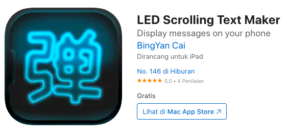 Aplikasi LED Scrolling Text Maker memiliki fitur dan fungsi yang hampir sama seperti aplikasi running text lainnya. Aplikasi produksi developer BingYan Cai ini memiliki rating 5.0 di App Store dengan ukuran 18.2 MB.