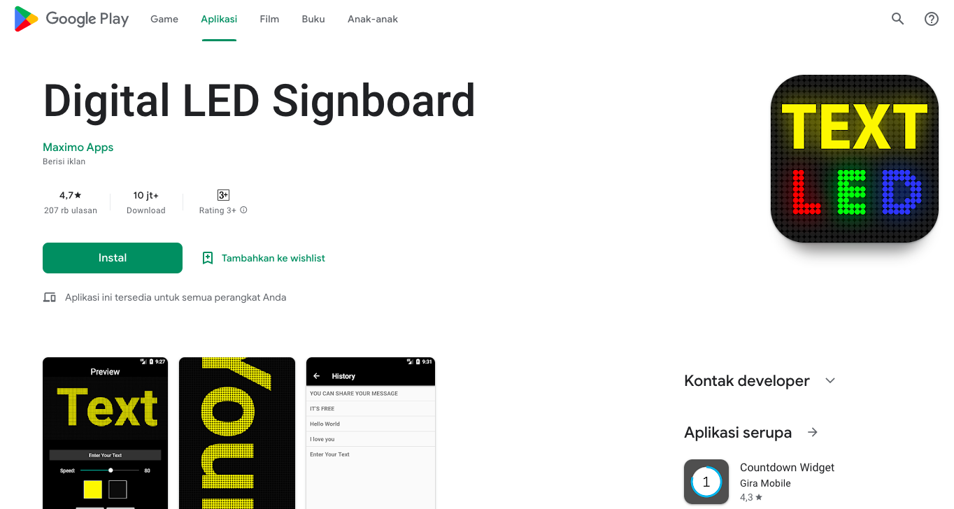 Aplikasi Digital LED Signboard bisa diunduh secara gratis di Play Store. Aplikasi ini memiliki rating 4.7 dari 5 dan sudah diunduh sebanyak 10 juta kali. Ukuran aplikasi ini 13 MB. Untuk menggunakannya sangat mudah loh. Pengguna yang sudah mengunduh aplikasi bisa langsung mengetikkan kalimat yang diinginkannya di kolom “Enter Your Text”. Setelah itu atur kecepatan yang diinginkan dan klik “Go”. Running Text akan otomatis memenuhi layar ponsel dan siap digunakan.