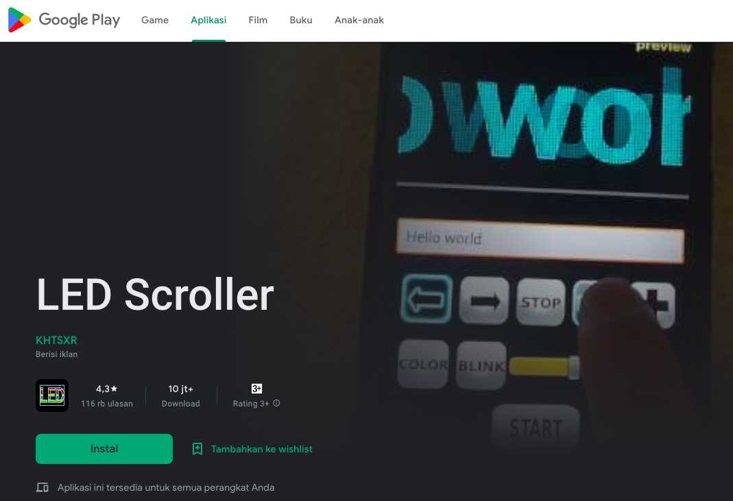 Aplikasi tulisan berjalan LED Scroller hanya bisa digunakan oleh pengguna smartphone Android. LED Scroller memiliki rating 4.3 dari 5. Aplikasi ini juga sudah diunduh sebanyak 10 juta pengguna dan memiliki ukuran 2.9 MB. Menariknya, dalam aplikasi ini, tulisan tidak hanya berjalan namun bisa dihentikan dengan fitur ‘Stop’ juga loh.