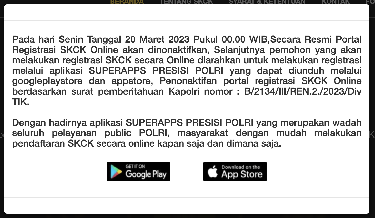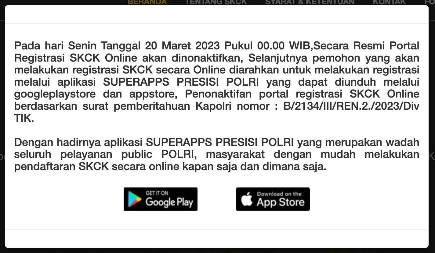 Berdasarkan situs resmi POLRI, portal website pendaftaran SKCK Online telah resmi dinonaktifkan, hal ini berlaku sejak per hari Senin, tanggal 20 Maret 2023 pukul 00.00 WIB. Kemudian, bagi masyarakat yang ingin mengurus SKCK secara online (daring) nanti akan diarahkan melalui aplikasi PRESISI - POLRI SuperApp.