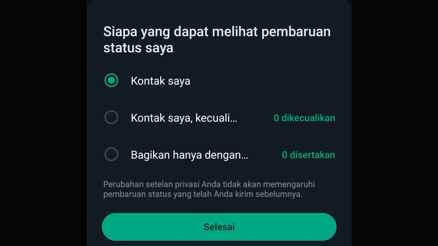Pengaturan ini tidak akan memengaruhi Status WhatsApp yang bisa dilihat. Artinya, jika kamu membatasi orang yang bisa melihat Status WhatsAPp yang kamu bagikan, kamu tetap bisa melihat semua Status WhatsApp dari orang yang kontaknya disimpan. Kecuali, jika seseorang membatasi kamu agar tidak melihat Status WhatsApp yang dibagikannya.