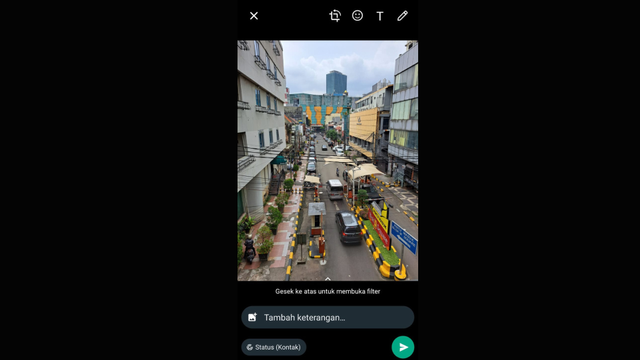 Buka aplikasi WhatsApp, kemudian pilih opsi Status. Kamu bisa menekan tanda + di foto profil atau menekan logo kamera yang terletak di kanan bawah. Kamu bisa mengambil gambar dan video secara langsung atau menggunakan yang sudah tersedia pada perangkat.