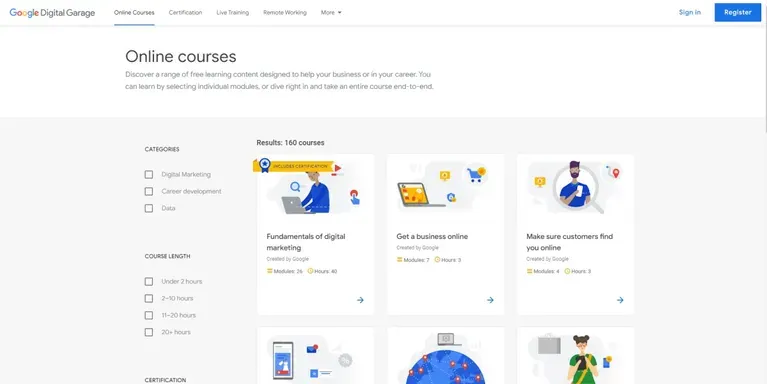 Salah satu pelatihan yang menyediakan sertifikasi gratis adalah Fundamentals of Digital Marketing (Dasar-dasar Digital Marketing) dan Elements of AI. Dua kursus tersebut mengharuskan partisipan menyelesaikan setidaknya 90% latihan dan menjawab dengan benar setidaknya 50% untuk mendapatkan sertifikat secara gratis.