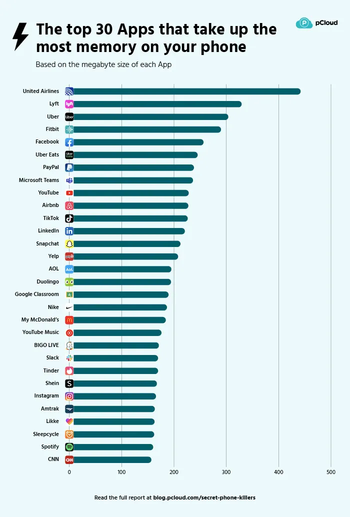 Menurut data PCloud, pada 3 (tiga) peringkat teratas dengan jumlah memori terbanyak, dipegang oleh United Airlines dengan total sebesar 437,8MB, diikuti oleh aplikasi Lyft dengan 325,1MB, dan terakhir Uber dengan 299,6MB. Selain itu, apabila aplikasi membutuhkan memori yang besar akan berakibat memperlambat HP (handphone).