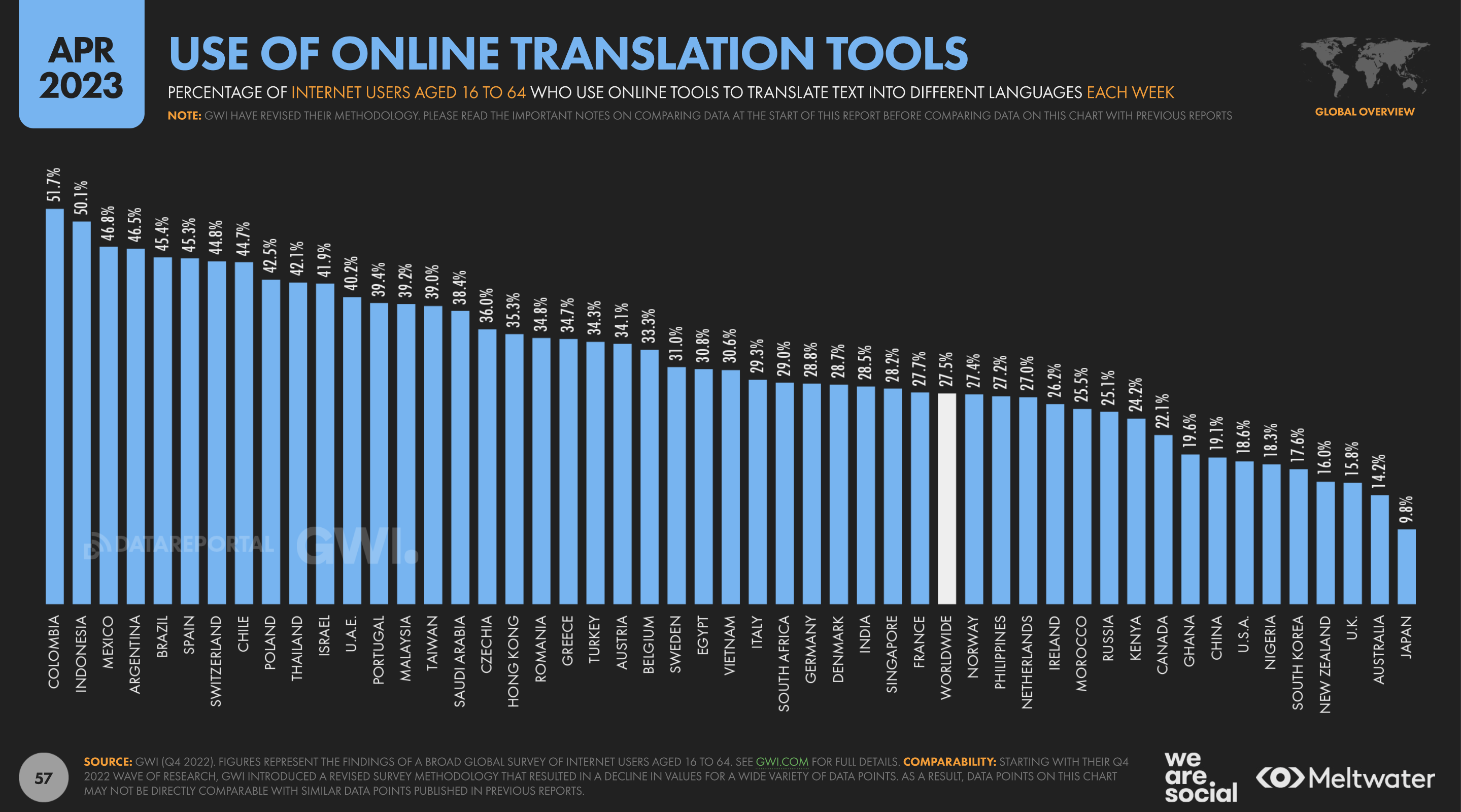 Seperti yang dikutip dari We Are Social, bahwa penduduk Indonesia menduduki peringkat kedua dalam penggunaan aplikasi translate online dengan 50,1 persen. Survei ini dilakukan terhadap pengguna internet berusia 16 hingga 64 tahun yang menggunakan aplikasi translate online dalam menerjemahkan ke bahasa lain setiap minggunya. Tentunya, hal ini dapat membuktikan bahawa masyarakat di Indonesia menyadari keuntungan dan kemudahan yang diberikan oleh aplikasi translate online