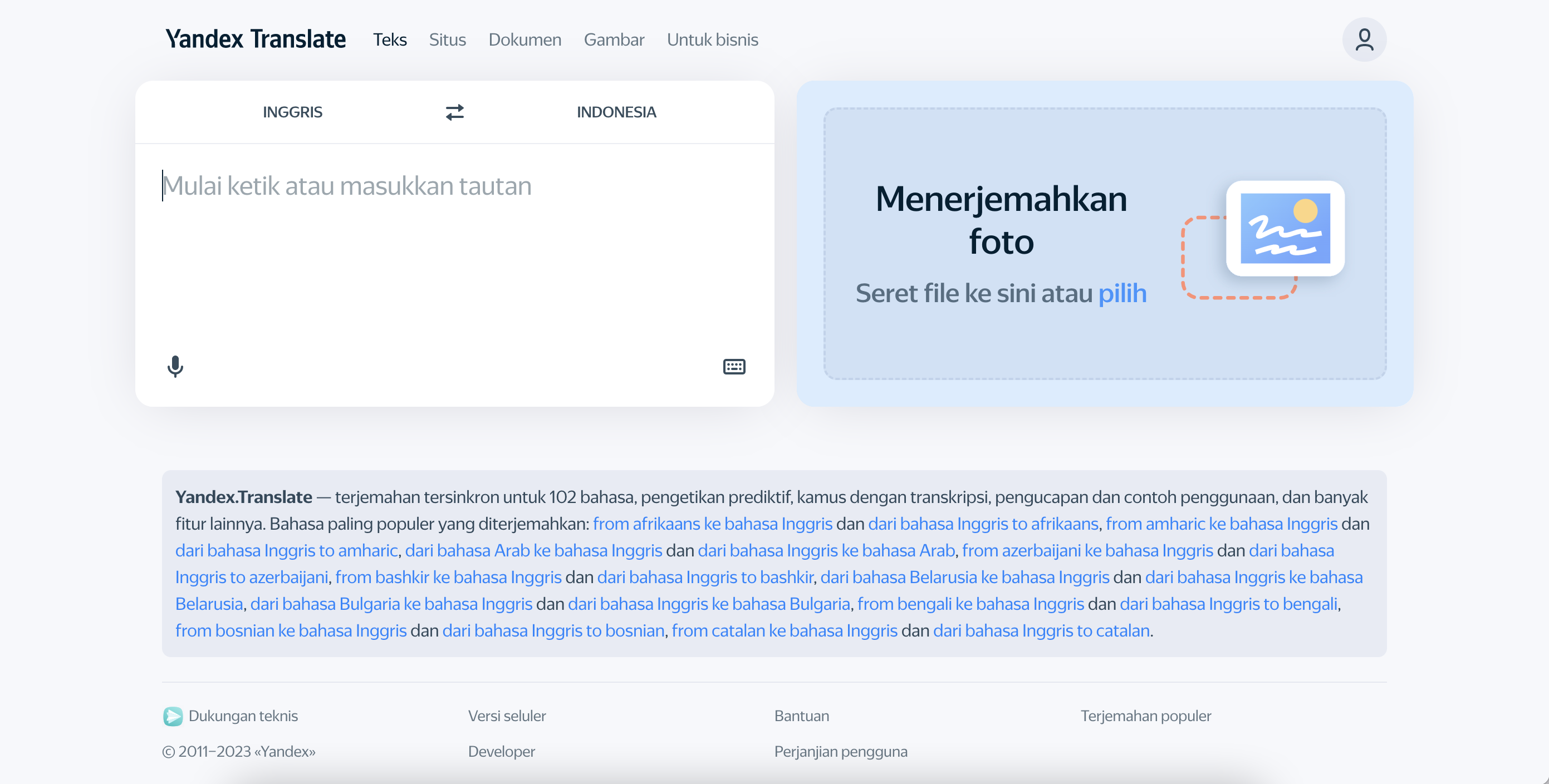 Yandex Translate yang berasal dari Rusia ini mampu menerjemahkan 94 bahasa dari seluruh dunia. Fitur yang hadir dan bisa digunakan ialah menerjemahkan kata, kalimat, dokumen, sampai dengan situs URL yang berbahasa asing. Selain itu, kalian juga bisa hanya dengan mengambil gambar seperti menu, rambu jalan, halaman buku, atau dari galeri yang memiliki teks untuk melihat terjemahannya tepat di atas gambar (hanya tersedia saat online pada aplikasi HP), dari input suara, mengunggah dokumen, dan bahkan menerjemahkan halaman web menggunakan Yandex.
