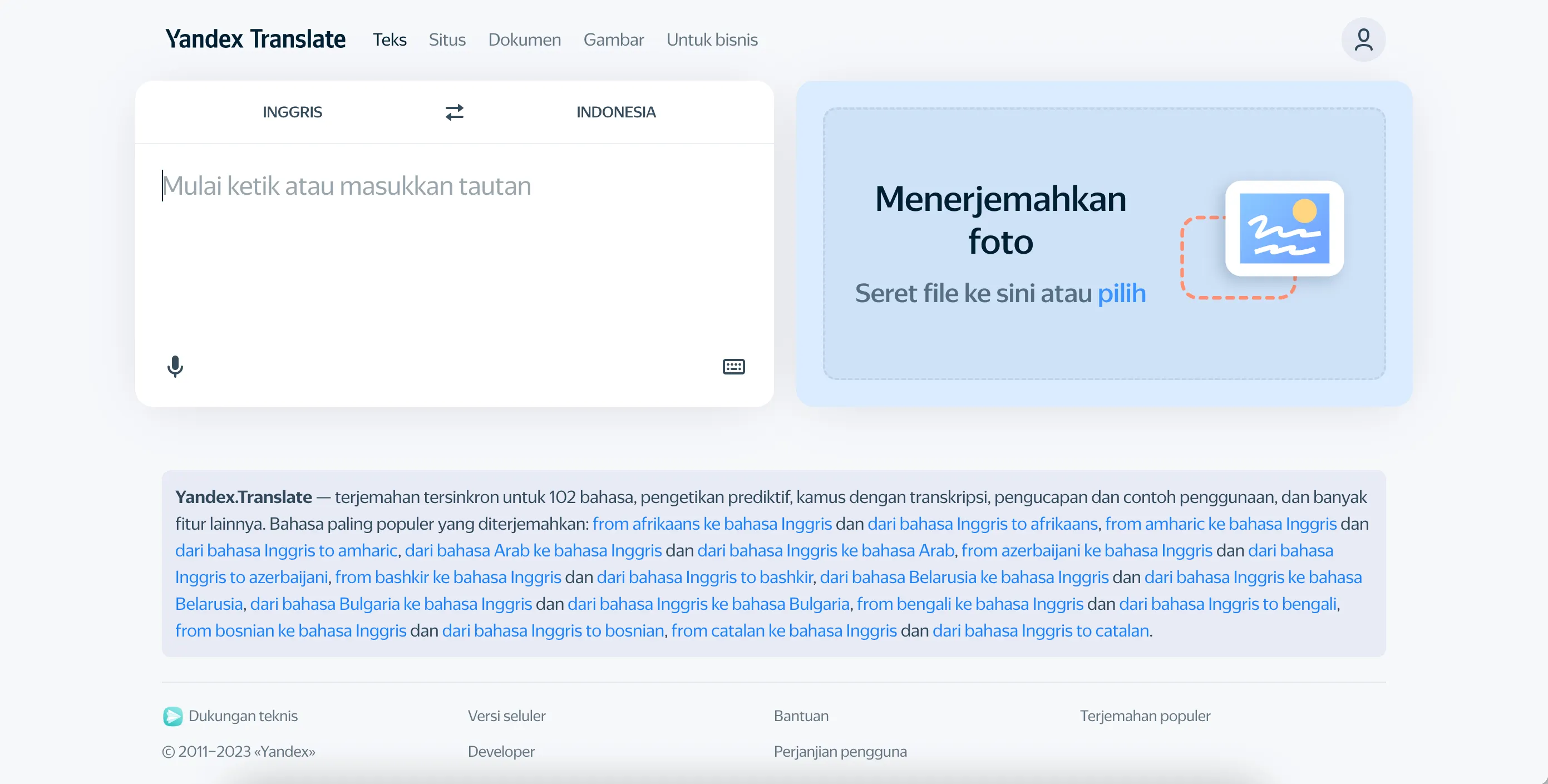 Yandex Translate yang berasal dari Rusia ini mampu menerjemahkan 94 bahasa dari seluruh dunia. Fitur yang hadir dan bisa digunakan ialah menerjemahkan kata, kalimat, dokumen, sampai dengan situs URL yang berbahasa asing. Selain itu, kalian juga bisa hanya dengan mengambil gambar seperti menu, rambu jalan, halaman buku, atau dari galeri yang memiliki teks untuk melihat terjemahannya tepat di atas gambar (hanya tersedia saat online pada aplikasi HP), dari input suara, mengunggah dokumen, dan bahkan menerjemahkan halaman web menggunakan Yandex.