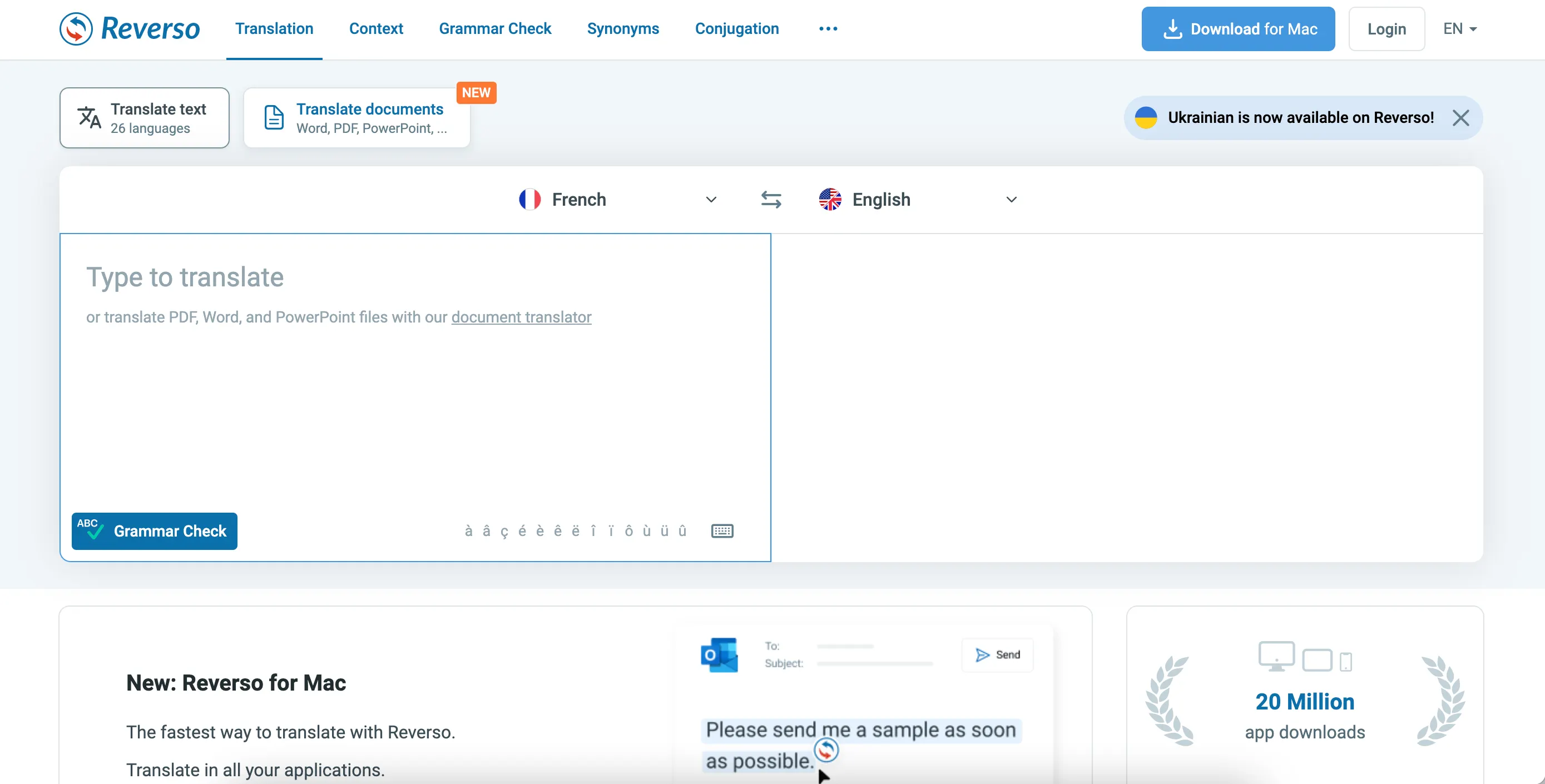 Reverso Translation adalah layanan translate online bertenaga AI ini dikembangkan oleh perusahaan Softissimo Inc. Alat ini mendukung 15 bahasa, termasuk bahasa Arab, Cina, Italia, Portugis, Belanda, Ibrani, Turki, dan Polandia. Namun, belum mendukung bahasa Indonesia. Fitur yang disediakan lengkap seperti terjemahan per kata maupun per kalimat hingga informasi sinonim dan konjugasi, mencari frasa idiom dan kata-kata sugestif ketika mengetik teks.