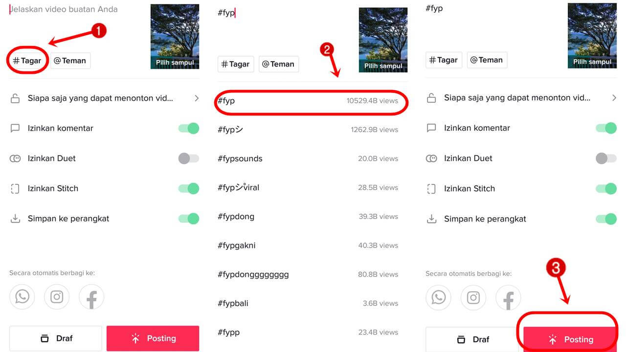 Menggunakan hashtag yang sedang trending akan membuat konten kamu dilihat oleh lebih banyak orang. Hal ini dapat mendorong konten kamu untuk tampil di “For You Page” dan meningkatkan jumlah pengikut.