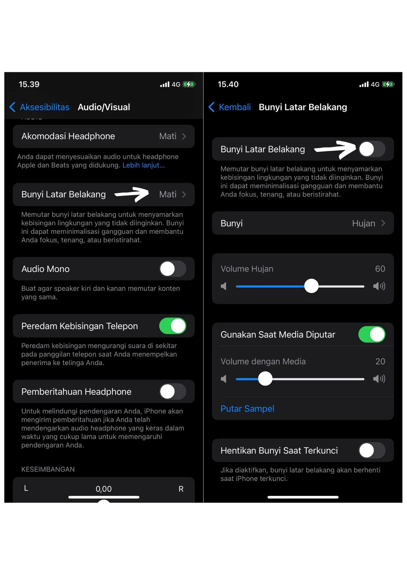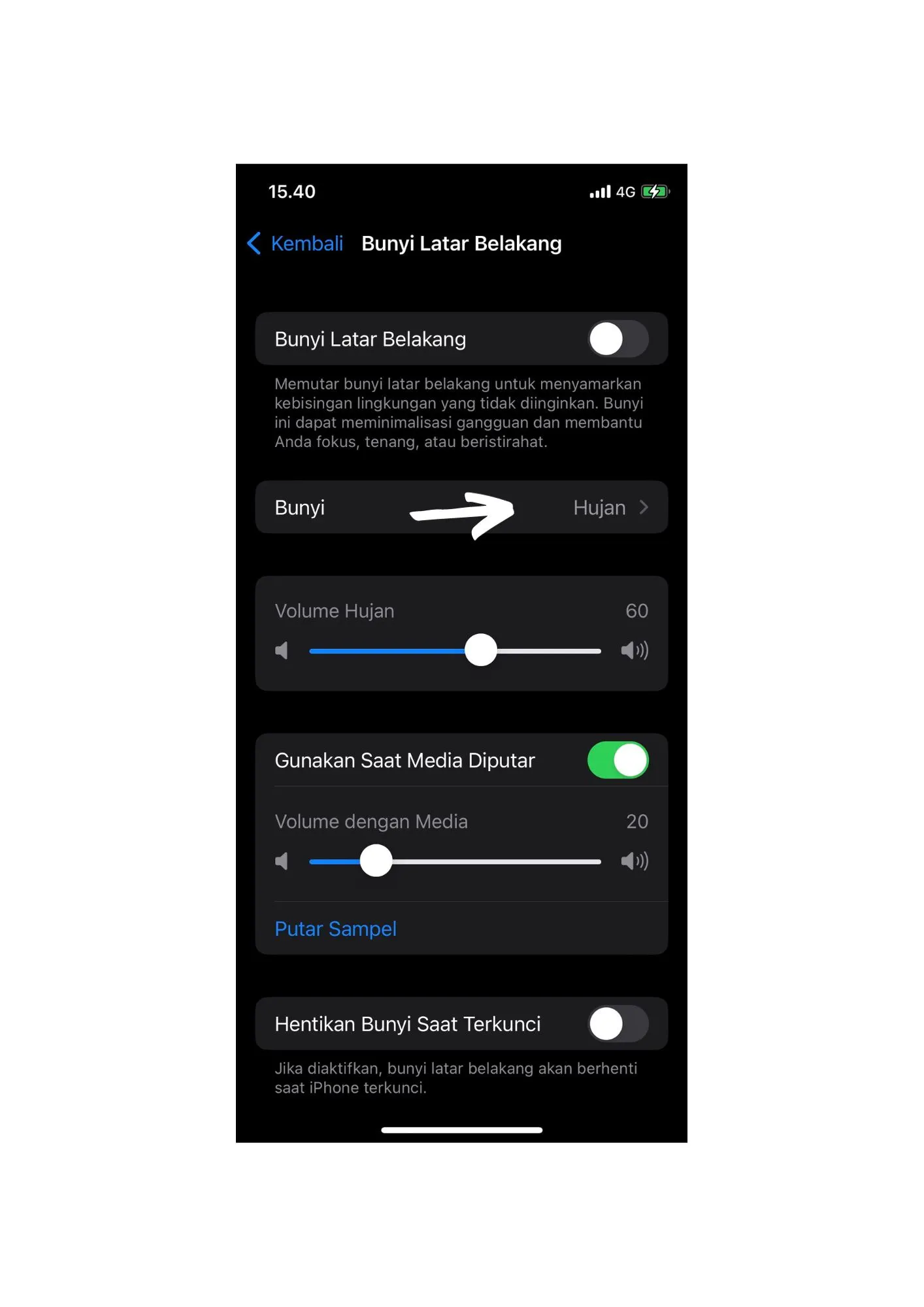 Langkah 4: Ketuk tombol "Suara Latar Belakang" dan kamu akan melihat tanda warna hijau jika kamu sudah mengaktifkan nya.
