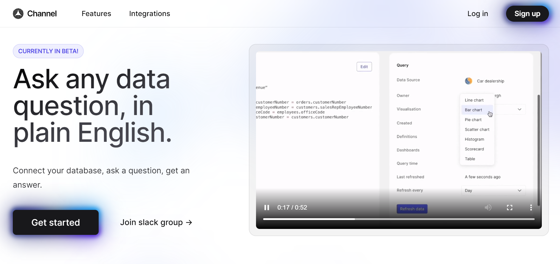 Kamu dapat menghubungkan kumpulan data yang berasal dari empat data warehause paling umum, seperti  Postgres, MySQL, BigQuery, dan Snowflake, dan kemudian mengajukan pertanyaan berdasarkan data data tersebut. Kemudian Usechannel akan menyajikan data dalam vidualisasi bagus sesuai dengan preferensimu. Usechannel dirancang sangat user-friendly agar bisa digunakan oleh siapa saja tanpa memiliki latar belakang IT.
