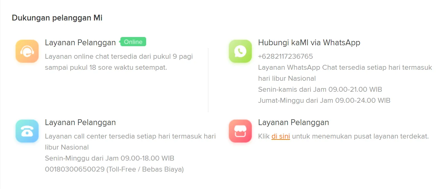 Nantinya Customer Service akan memabantu pengguna sesuai dengan kendala dan panduan yang telah diberikan. Namun, pastikan untuk menyiapkan data akun terakit untuk mempermudah dan mempercepat proses yang dilakukan. Untuk informasi lebih detail, kamu dapat mengunjungi https://www.mi.co.id/id/service/online/.