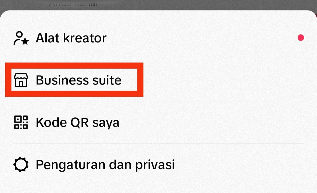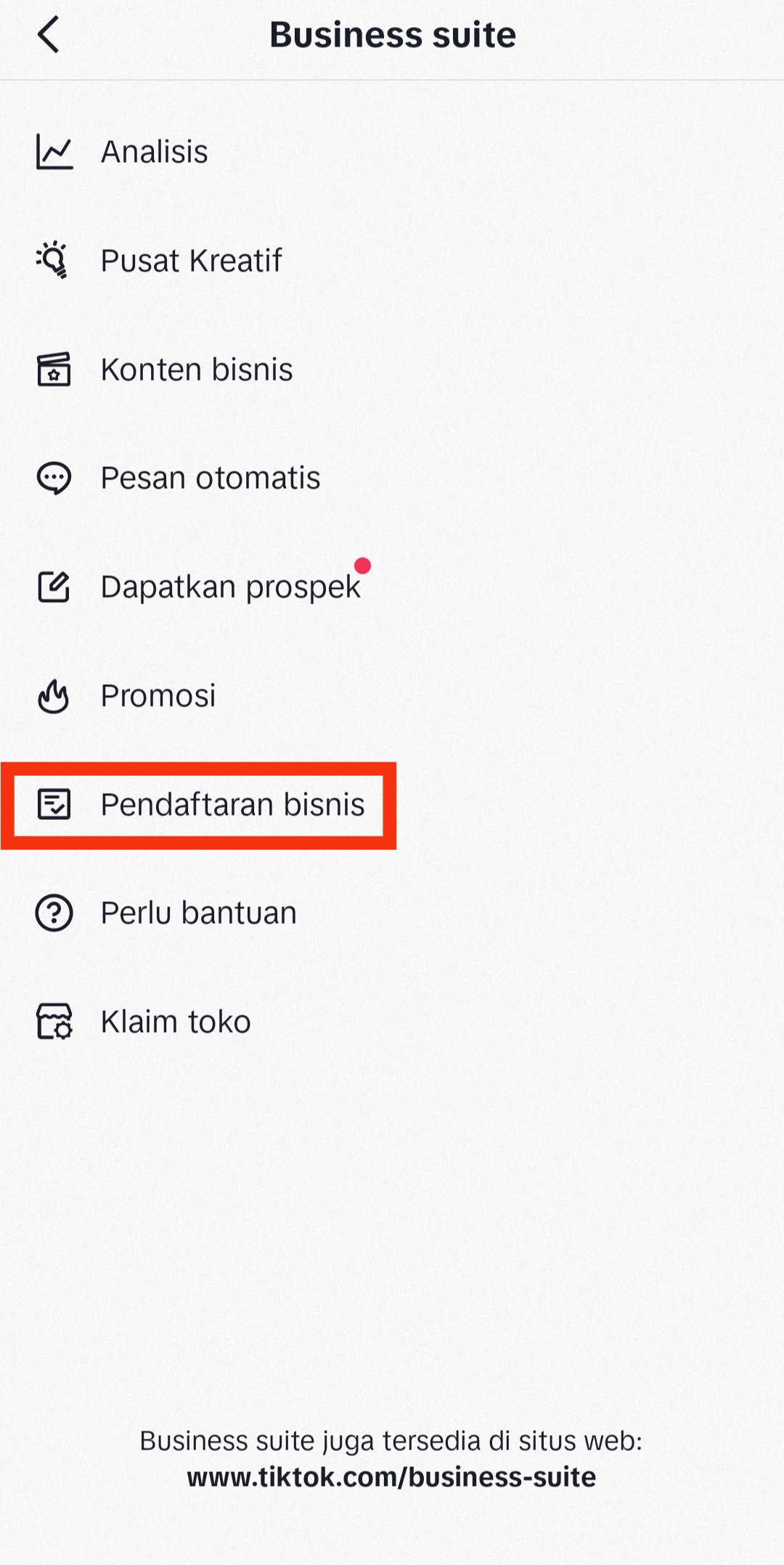 5. Akun TikTok pun telah berubah menjadi akun bisnis. Namun, tahapan ini belum selesai. Ada beberapa langkah lagi yang harus dilakukan sebelum akhirnya bisa menambahkan link Shopee di bio TikTok. Pada akun profil TikTok, klik pada tanda tiga garis di pojok kanan atas, pilih "Business suite" dan kemudian pilih "Pendaftaran bisnis".