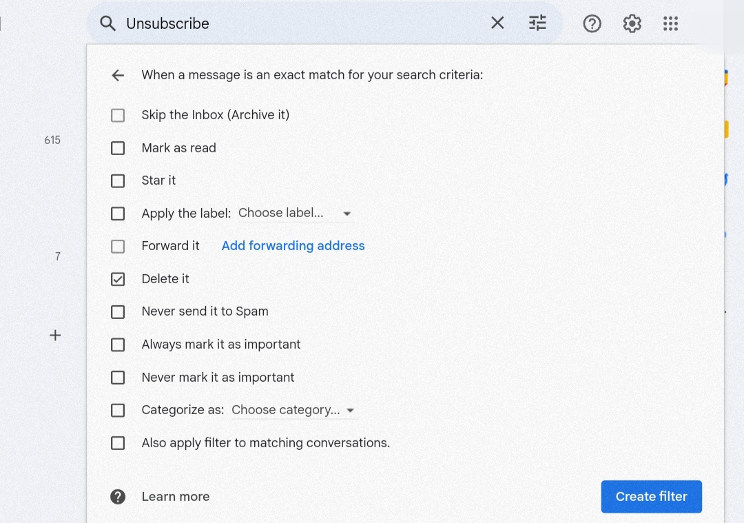 - Klik "Create filter", lalu centang pada kotak "Delete it".