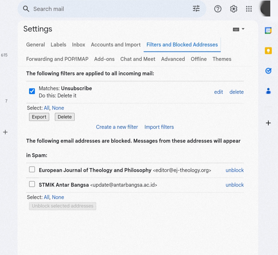 - Selanjutnya akan ditampilkan filter yang diterapkan oleh pengguna. Pada menu "The following filters are applied to all incoming mail", ceklis filter yang akan dihapus. Dalam tutorial ini, filter yang akan dihapus yaitu filter "Unsubscribe".