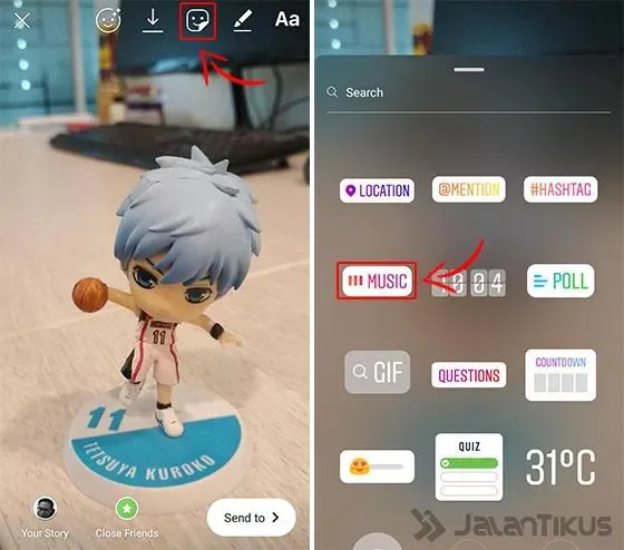 Kamu dapat menikmati fitur tersebut langsung. Hanya tinggal merekam video untuk story seperti biasanya. Lalu, selanjutnya buka menu stiker yang berada di atas, dan pilih menu musik.