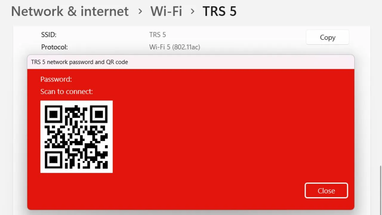 - Pilih jaringan yang Anda inginkan, kemudian klik View di sebelah "View Wi-Fi security key." Windows 11 akan menampilkan jendela dengan password Wi-Fi dan QR Code.