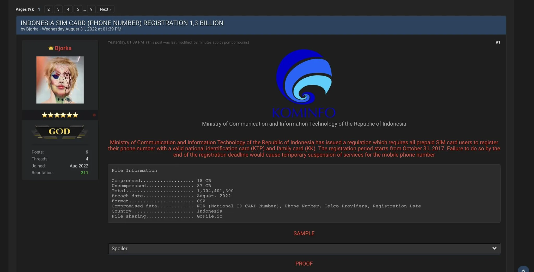 ⚠ 1,3 miliar data pendaftaran kartu SIM telepon Indonesia bocor! Data pendaftaran meliputi NIK, nomor telepon, nama penyedia (provider), dan tanggal pendaftaran. Penjual menyatakan bahwa data ini didapatkan dari Kominfo RI. pic.twitter.com/ctdvuKwUn8
