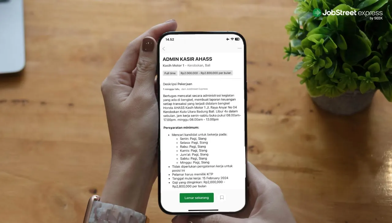 Jenis lowongan yang tersedia di JobStreet Express antara lain Kasir, Front Office, Sales/Marketing, Kitchen Crew, Staff Gudang, Pekerja Harian, dan masih banyak lagi. Tidak hanya memudahkan perusahaan dalam mencari kandidat yang tepat, JobStreet Express juga terus berupaya memberikan kemudahan bagi pelamar kerja. Hal ini merupakan upaya JobStreet Express untuk menjadi mitra pencarian kerja yang dapat diandalkan untuk berbagai kalangan. Berbagai daftar lowongan kerja terpercaya dapat diakses dengan mudah melalui website id.jobstreetexpress.com dan aplikasi JobStreet Express yang dapat diunduh melalui App Store atau Play Store jobstreetexpress.app.link/unduhjse.
