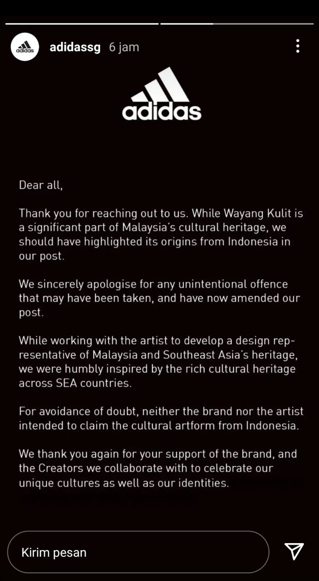 Selain itu, Adidas Singapura meminta maaf usai menyebut Wayang Kulit dari Malaysia.
