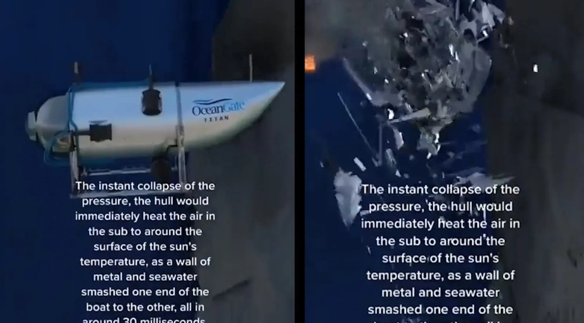Ketika sebuah kapal selam meledak, tekanan air yang sangat tinggi di laut dalam akan menghancurkan kapal selam tersebut. Di kedalaman 3.800 meter di lokasi bangkai Titanic, tekanan air mencapai 6.000 PSI atau sekitar 400 kali lebih tinggi dari tekanan di permukaan laut.