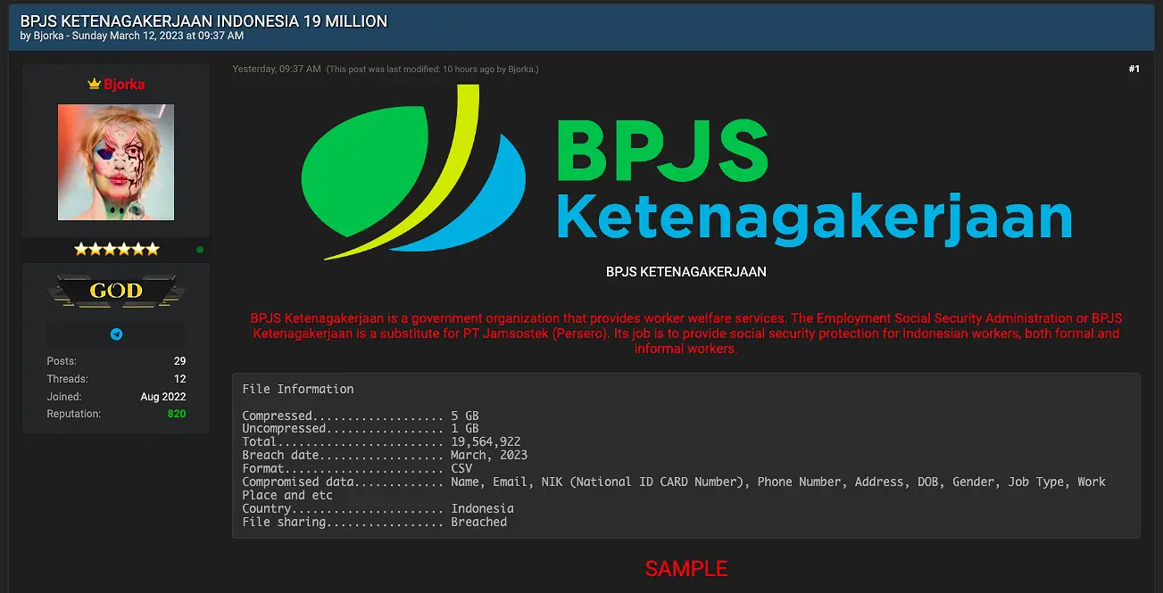 Bjorka Bocorkan 19 Juta Data yang Diduga Milik BPJS Ketenagakerjaan