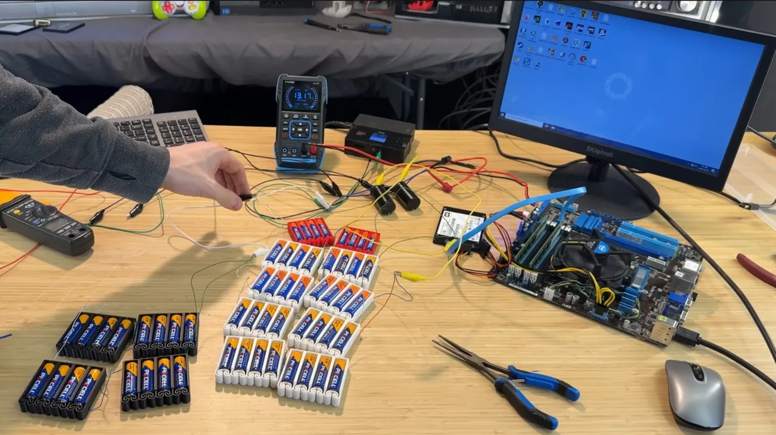 Agar sistem lebih stabil, ia melakukan modifikasi signifikan pada rancangan sirkuitnya. Belajar dari kegagalan eksperimen sebelumnya yang hanya menggunakan 56 baterai, kali ini ia menyolder ulang seluruh rangkaian dengan kabel yang lebih tebal dan menambahkan dua kapasitor besar. Komponen kapasitor ini berfungsi krusial sebagai penyangga (buffer) untuk menstabilkan tegangan yang cenderung naik-turun serta membantu menangani lonjakan beban daya saat perangkat keras mulai bekerja maksimal.