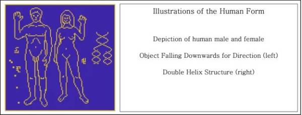 Para ilmuwan telah menggabungkan gambar struktur DNA dengan foto digital bentuk laki-laki dan perempuan. Pesan tersebut diperlihatkan keduanya tengah melambaikan tangan, agar tampak lebih ramah untuk para alien. Selain itu diperlihatkan sebuah objek yang jatuh ke arah bawah untuk melambangkan gravitasi di Bumi.