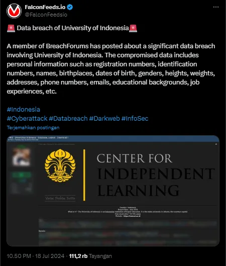 Sebelumnya akun @FalconFeedsio mengunggah tangkapan layar dari situs BreachForums disertai caption “Seseorang di BreachForums telah memposting tentang pelanggaran data signifikan yang melibatkan Universitas Indonesia. Pelanggaran data tersebut termasuk informasi pribadi seperti nomor registrasi, nomor identifikasi, nama, tempat dan tanggal lahir, gender, tinggi badan, berat badan, alamat rumah, nomor telepon, email, pendidikan, pengalaman, dsb,” tulis akun tersebut.