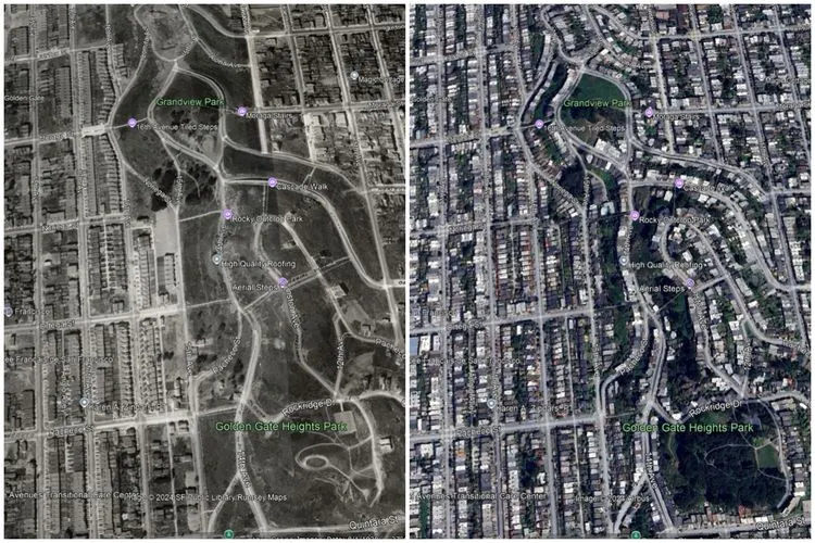 Melalui contoh gambar di bawah, terlihat adanya perbedaan struktur daerah di San Francisco, California, Amerika Serikat. Perbedaan gambar ini diambil dengan jarak kurang lebih 86 tahun, yaitu tahun 1938 di gambar sebelah kiri dan tahun 2024 untuk gambar sebelah kanan.