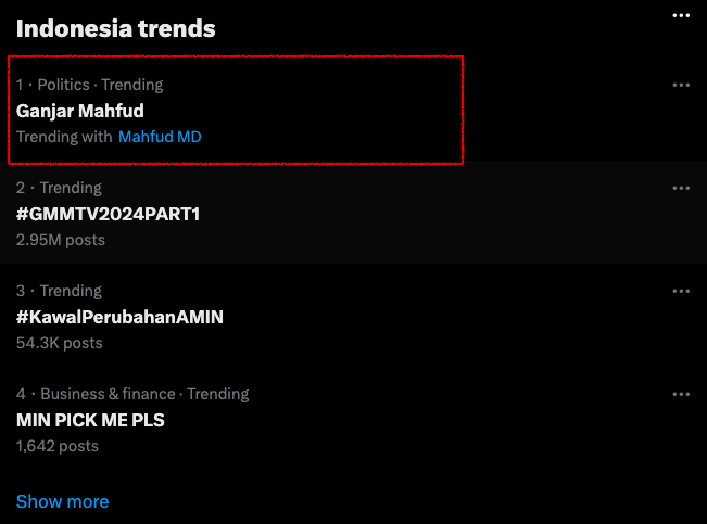 Megawati Soekarnoputri menjelaskan bahwa Mahfud secara resmi dipilih oleh PDIP sebagai cawapres untuk Ganjar Pranowo. Hal ini membuat Mahfud menduduki puncak daftar trending topic di media sosial, yang kini berganti nama menjadi "X." Ganjar dan Mahfud menjadi topik yang paling banyak dibahas, mencerminkan antusiasme dan minat publik yang tinggi terhadap pasangan ini.