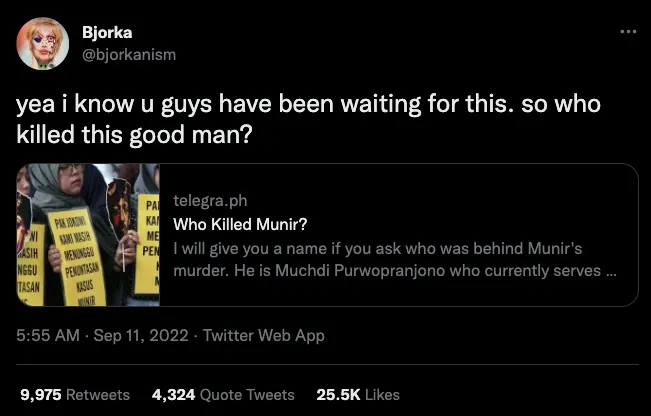 "Why so many people tagging me about munir and supersemar (kenapa banyak orang yang men-tag saya tentang munir dan supersemar-red)," kata Bjorka di akun Twitter miliknya (10/9/2022).