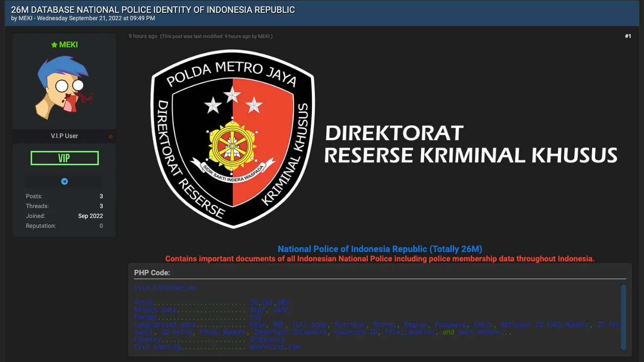 Teknologi.id - User forum hacker Breached.to dengan nama Meki baru saja mengunggah utas atau thread bertajuk '26M DATABASE NATIONAL POLICE IDENTITY OF INDONESIA REPUBLIC'. Meki mengklaim telah membobol data Polda Metro Jaya.