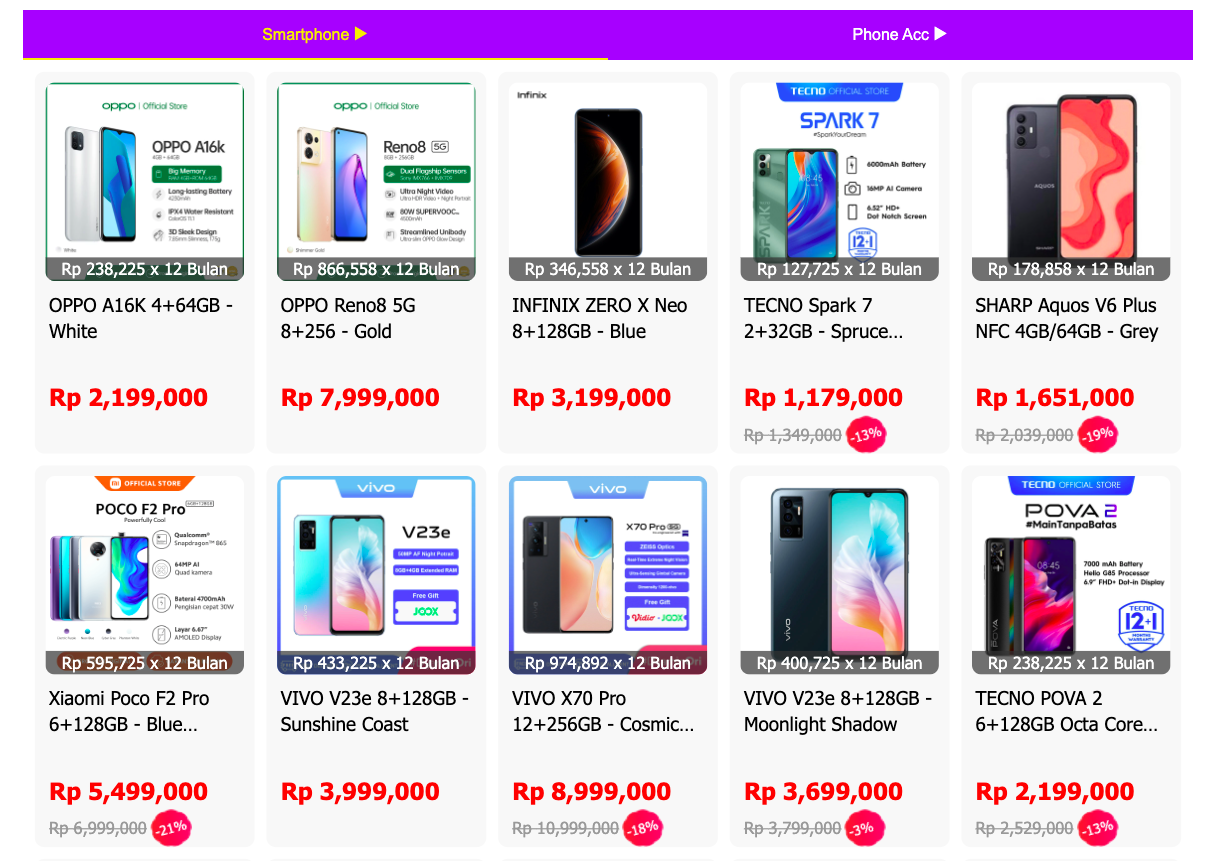 Sejumlah smartphone terlihat banting harga atau diberikan beragam diskon. Selain itu dalam banner di bagian atas situs tersebut tampak beberapa penawaran diskon besar-besaran mulai dari 40%, 80% hingga 90%.