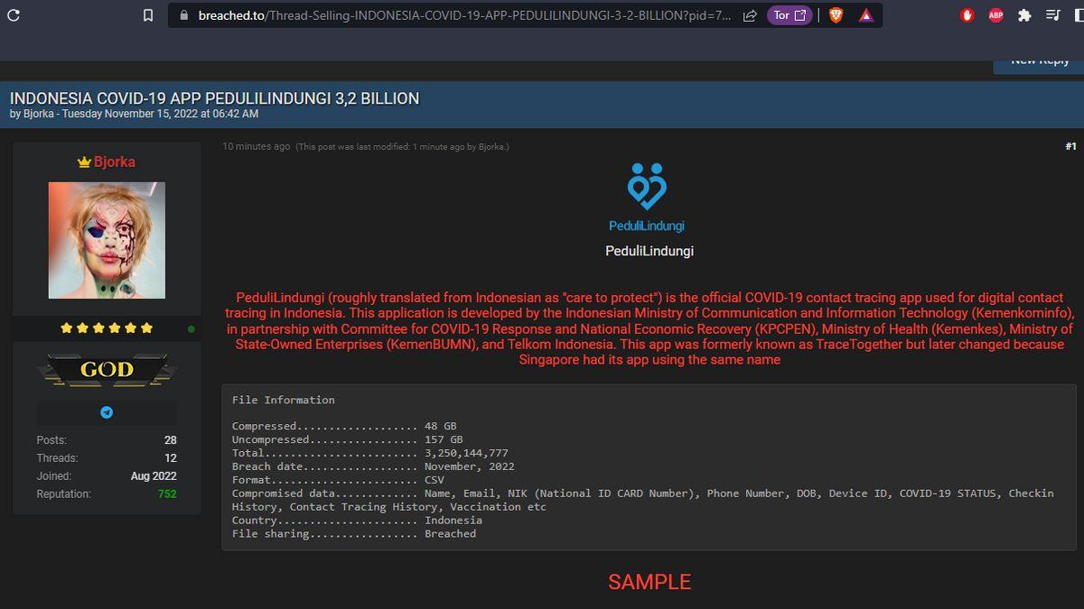 "Indonesia Covid-19 app PeduliLindungi 3,2 billion," begitu judul unggahan Bjorka di situs BreachForums, Selasa (15/11) pukul 06.42 waktu unggahan, atau pukul 13.42 WIB.