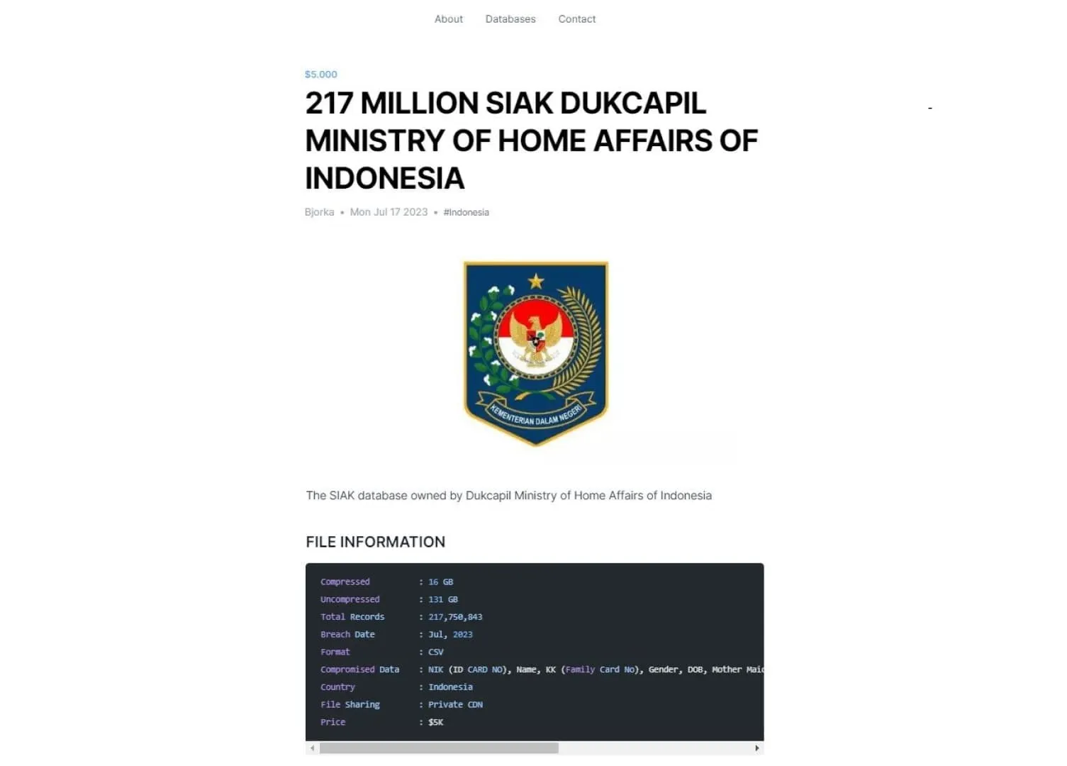 Pada Selasa, 18 Juli 2023, akun Twitter @DailyDarkWeb memposting informasi tentang penjualan dugaan 217,7 juta data SIAK dari Ditjen Dukcapil Kemendagri di situs gelap atau Dark Web. Data tersebut memiliki ukuran sebesar 131 GB.